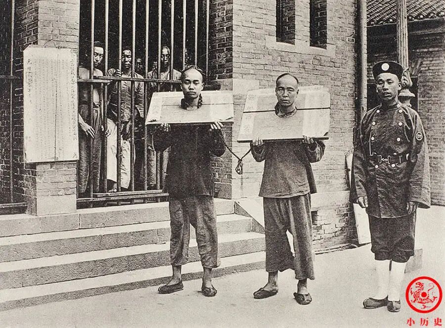 两个犯人戴着枷板,留下了永恒的影像。大家注意一个细节,他们的辫子被巡捕绑在了一起,更方便管理。监牢里挤满了各色人等,隔着铁窗好奇地看镜头。