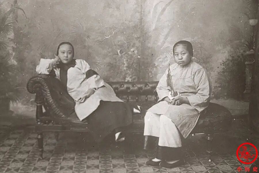 左边这位裹着“三寸金莲”,右边这位是天足,代表着不同的生活方式。她们的服装富有传统特色,发型很时尚,额前那若隐若现的刘海将在以后的时代里愈发明显。
