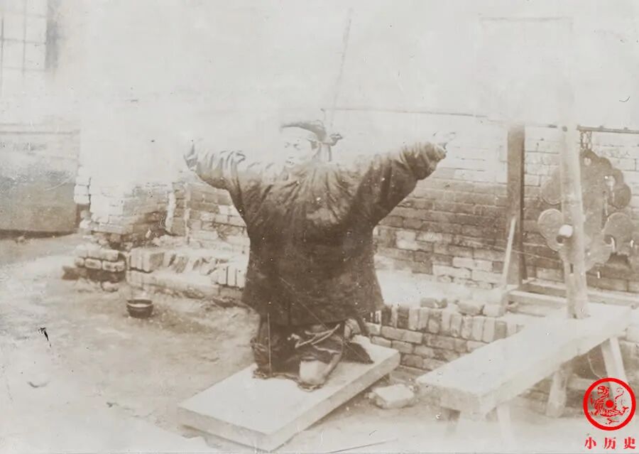 这名男子正在遭受酷刑的惩罚,双手被捆缚于木架,跪在倾斜的石板上,膝盖下放着一坨铁链,那种痛苦大概很难描述。这种酷刑的细节处处显示着执法者处心积虑的设计,倾斜的石板、膝盖下的铁链,都是加重肉体痛楚的方法。