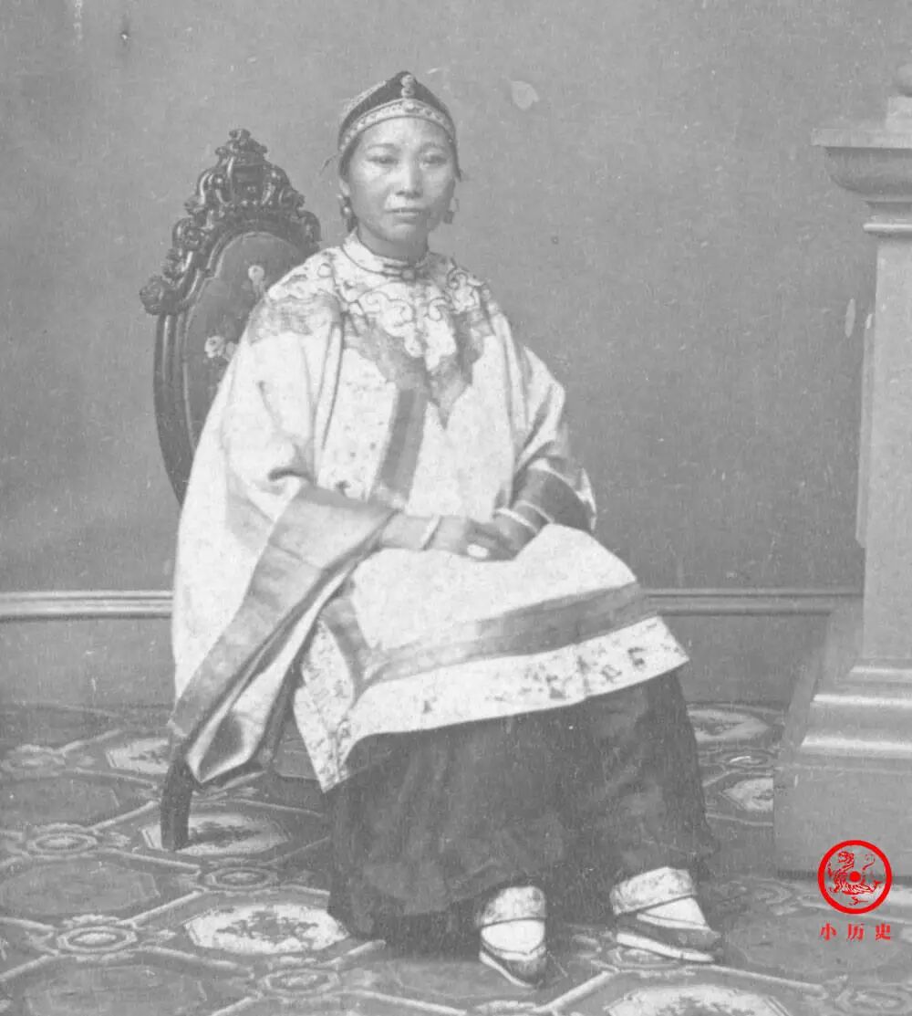 这位妇女穿着宽袍大袖的袄裙,衣服上精美的纹样显示着她的身份地位。她虽然裹了小脚,不能劳作,但家境优渥,不愁吃穿。多说一句,这身衣服也是汉服的一种款式。