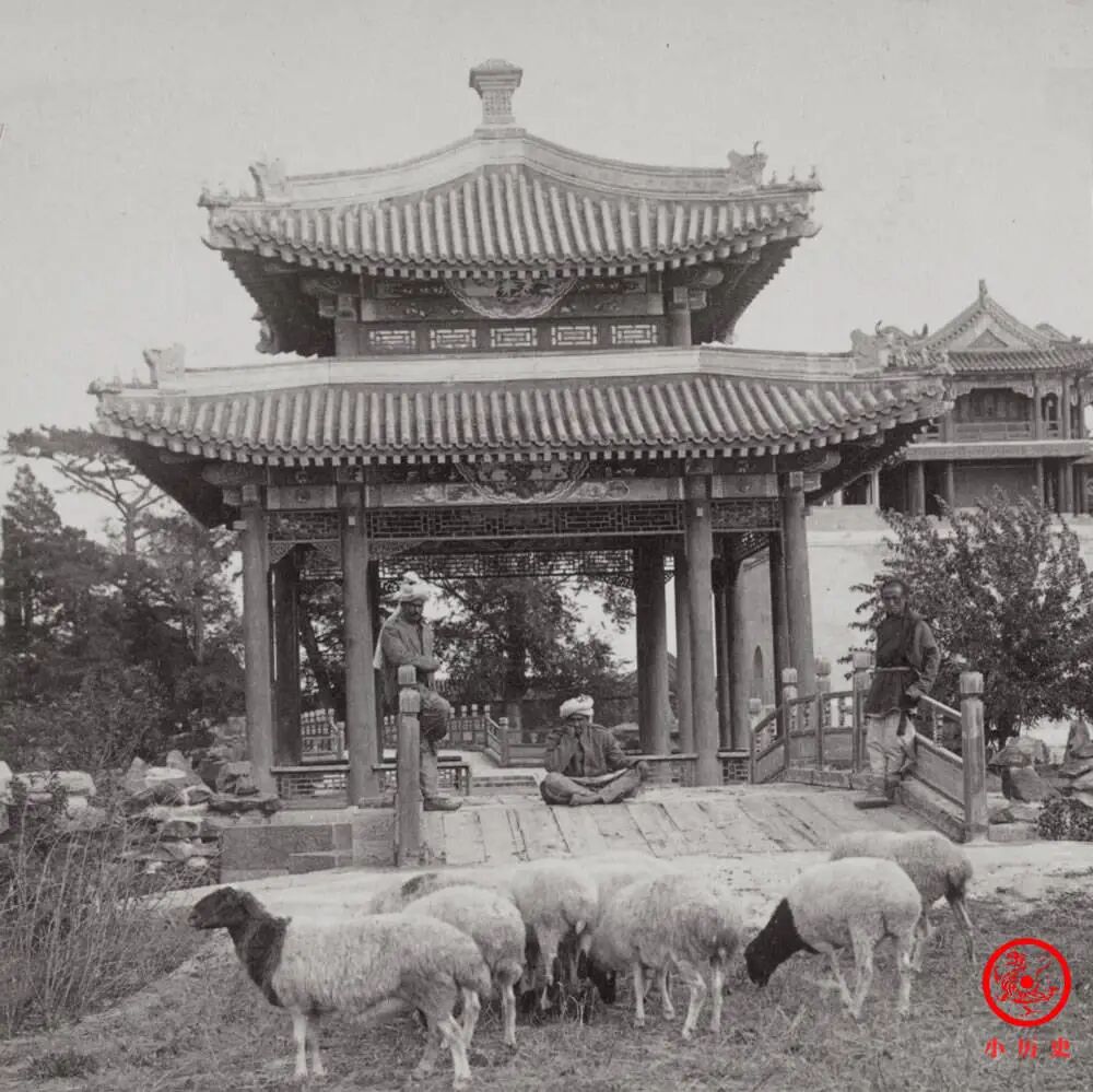 照片里有两个印度士兵,我们判断这张照片拍摄于1900年或1901年,当时颐和园处于八国联军的控制下,慈禧太后和光绪帝则逃到了西安行宫。一群羊在悠闲地吃草,一般情况下这是不可能发生的。堂堂皇家园林,竟成了牧场,太后知道了鼻子都能气歪。