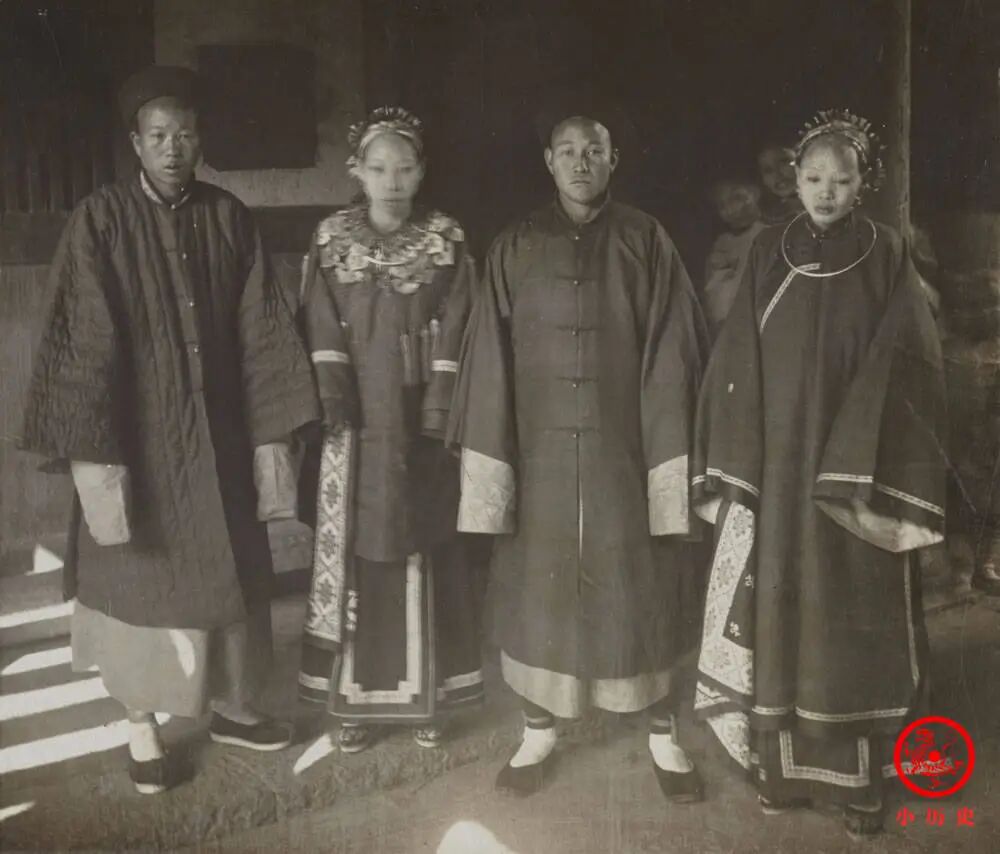 两位新娘所穿红妆的款式在晚清很普遍,但其发型比较特别,露出大额头,可能是一种地方传统。这样的新娘,嫁给单身的你,你敢要么?