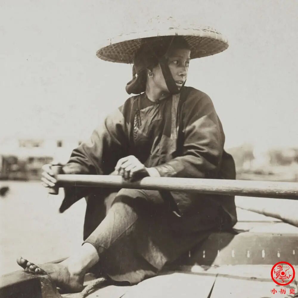 这位女子与上图中的贵妇相反,她留着天足,正在为生计忙碌。虽然她没有漂亮的衣服,但她比小脚贵妇多了几分生气与活力。
