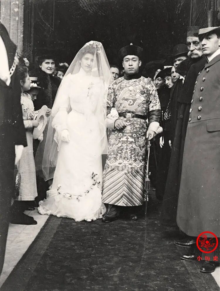 1902年10月16日,清朝驻法国公使署内,驻法公使裕庚次子馨龄大婚,新娘是钢琴教师Mlle Genevieve Deneu。馨龄穿清朝官员吉服蟒袍,新娘穿西式婚纱,构成一幅中西合璧的婚礼图景。这在当时属于少见的跨国婚姻。