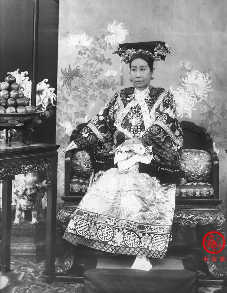 老佛爷所穿服装有着无与伦比的精美,虽然是黑白照片,但仍能看出纹饰泛出光芒。她的衣服大量使用了金线。69岁的老太太坐在那里,不怒自威,面露凶光。她在太监、宫女面前常常无端发怒。溥仪在《我的前半生》一书中记载道,一个太监陪她下棋,玩到兴奋处说了句“奴才杀老祖宗的这只马”,竟惹得太后大怒:“我杀你一家子!”然后即刻叫人把这个太监拉出去活活打死了。