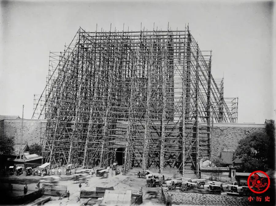 照片记录了前门城楼的工地,难得一见。前门的正式名称为正阳门,是明清时期北京内城正南门,位置十分重要。1900年6月,义和团烧毁了前门箭楼,不久八国联军占领北京后,英印士兵又烧毁了前门城楼。事变平息后,清廷于1903年开始重建前门,1906年竣工。