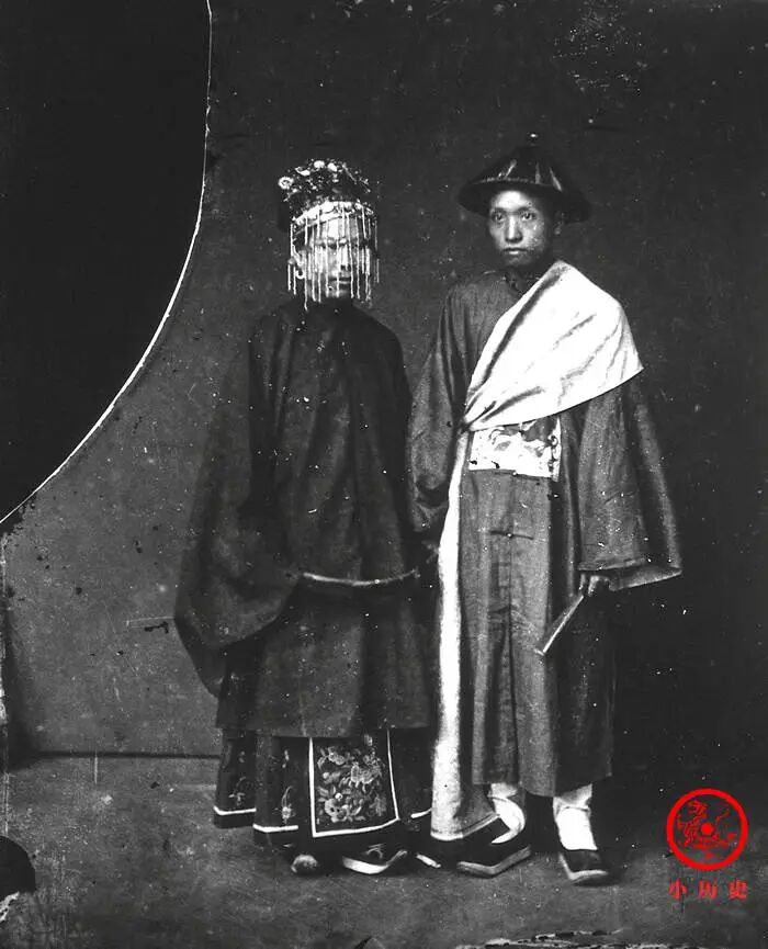 一对新人身穿盛装华服,在婚礼上合影留念,这个幸福时刻被定格下来,成为永恒。很遗憾照片是黑白的,我们无法感受那种光彩照人的气场。新郎似乎不太适应面对镜头,眼睛瞪得溜圆,表情很紧张。照片是从晚清常见的玻璃板底片洗印出来的,左上角缺失一大块。