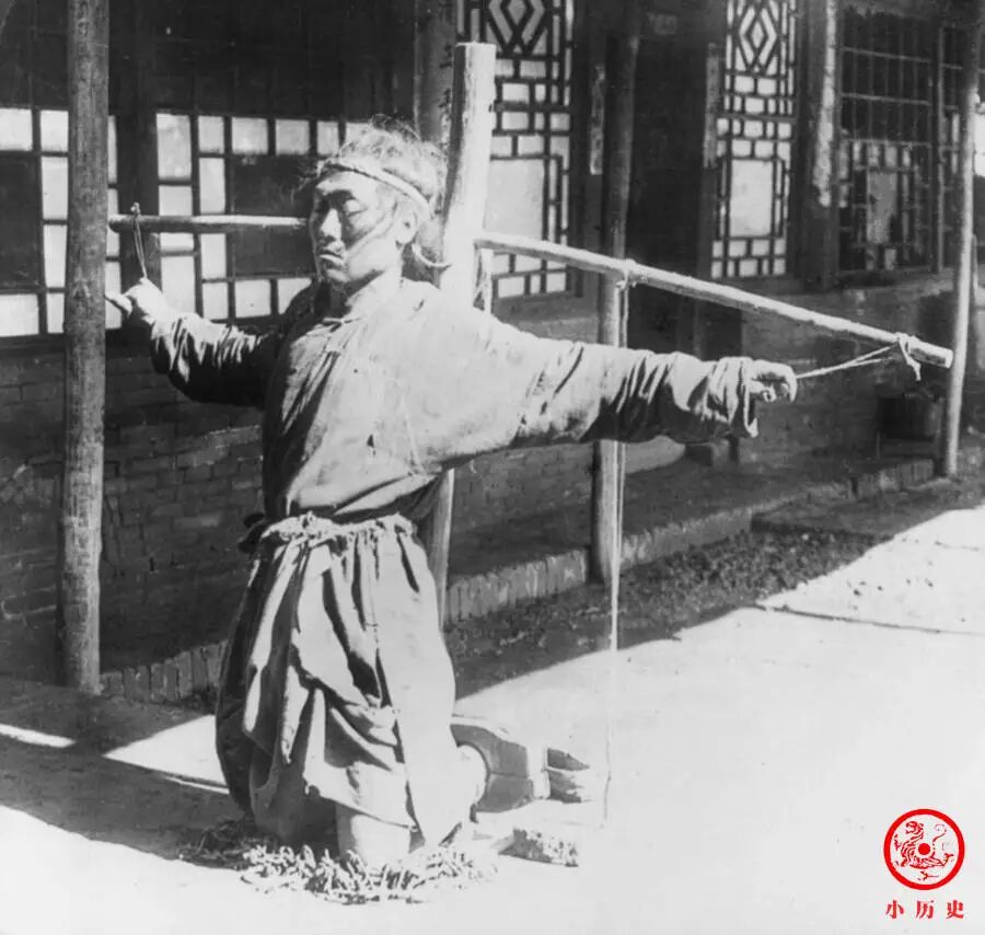 这张照片记录了囚徒受刑的场景。我们不知道他犯了什么罪过,看上去挺严重的。他被绑在木架上,双脚戴着镣铐,双膝跪在一堆铁链上,痛苦不堪。