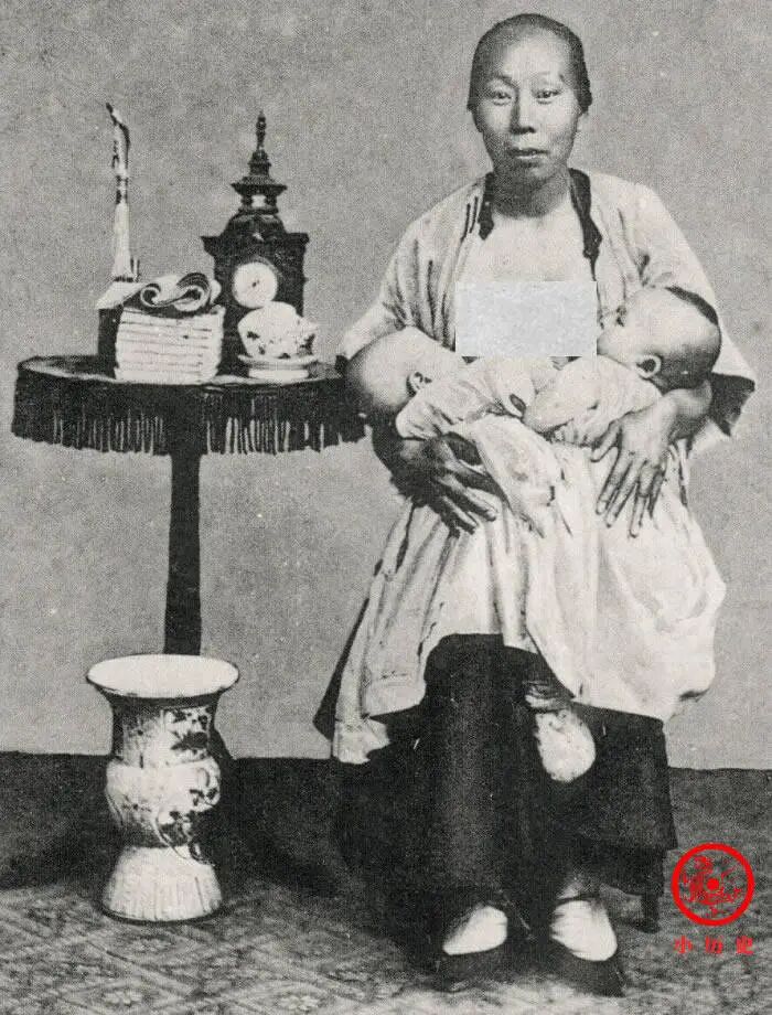奶妈喂养别人家的孩子,从中得到一定报酬,然而她自己的孩子却只能以米汤为生,甚至一年时间都不能与自己的孩子相见。这张照片可能是在外国摄影师的导演下拍摄的。