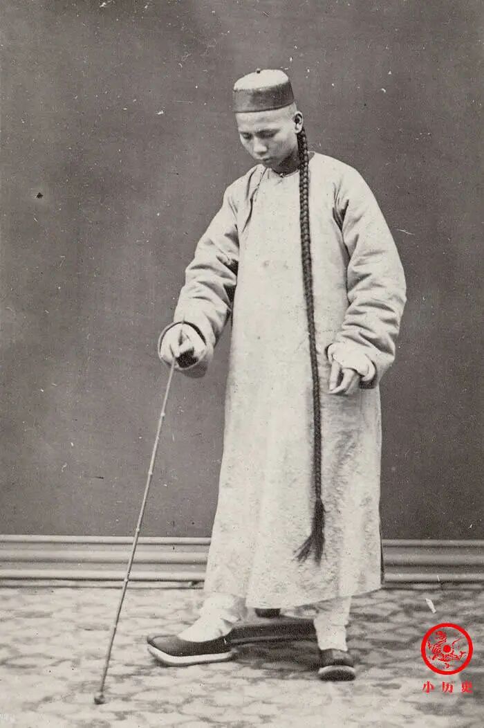一名男子穿着长衫,因视力不佳,手持木棍,试探着前行。他的大辫子又粗又长,长度达到膝盖以下,特别引人注目。