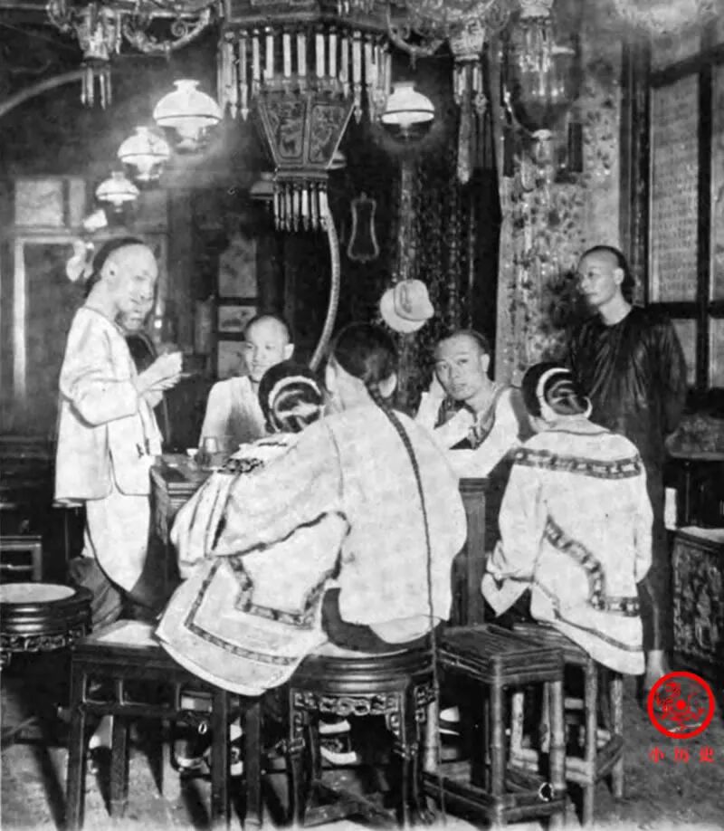 “花船”就是以船为载体、飘荡在河流湖泊上的青楼妓馆,浙江、福建、广东等地都有相关记载。我们看照片中的情景,舱内装饰非常讲究,商人、士绅、官吏都喜欢出入这种风月场所。