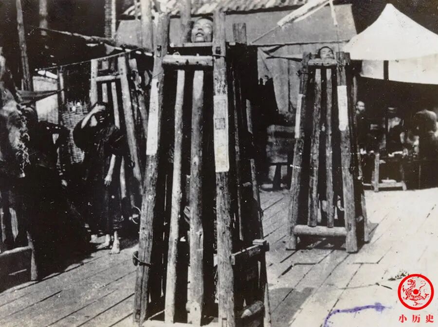 这张照片记录的内容,是晚清执行“站笼”刑罚的情景。《大清律例》并没有“站笼”刑罚的相关规定,地方官吏发挥想象力,用这种残酷的方式折磨囚犯。“站笼”能将被困其中的人慢慢折磨致死。