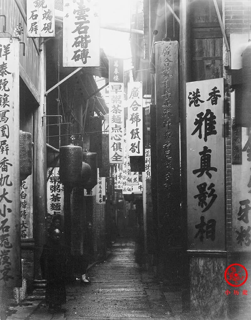 各种各样的招牌实在太多,密密麻麻,在这条窄窄的街道上几乎到了遮天蔽日的程度。通过数不清的招牌我们看看有什么店铺:卖砚台的、卖牙粉(牙膏)的、卖早茶的、卖布料的……可谓应有尽有、琳琅满目。当然,最显然还是雅真照相馆。