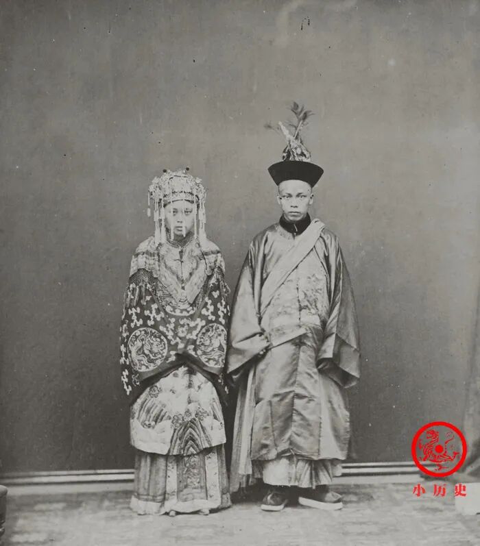 新娘头戴凤冠、身穿华服,我们可以想象那种鲜艳的红色;新郎身穿清朝官服,但不能确定他是不是官员身份。朝廷规定,平民男子在结婚当日可以穿官服。