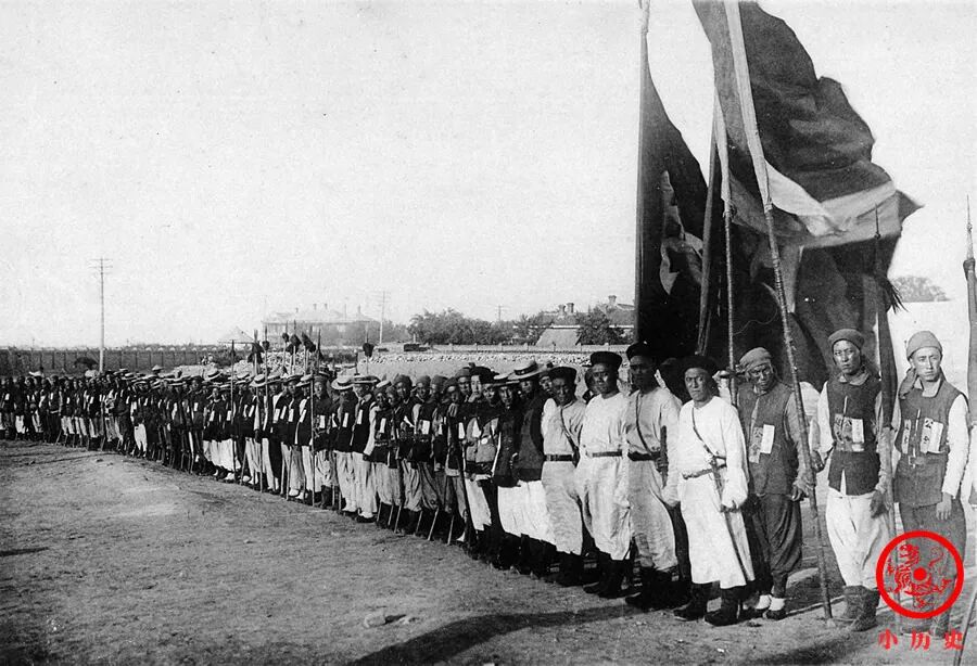 队列里有的人配步枪、有的人持长矛,服装也不统一,很可能是临时拼凑的一支部队。他们在干吗?此时是1904年,日本与俄国正在辽宁开战,而根据慈禧太后的谕旨,清军选择中立,并为日俄两国划出了交战区域。这支部队很可能是在警戒,防止日俄两国突破划定的交战区域。