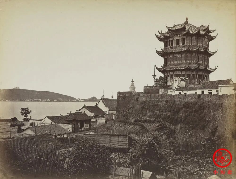 黄鹤楼是武汉的地标,拥有灿烂的历史和不可取代的地位。这张照片所记录的,是1868年修建的黄鹤楼,“皆用苗地大杉木四十八根圆柱头为柱,不垒墩”。它结构完美,楼顶为攒尖顶,三层均有排檐起翘,势如黄鹤,展翅欲飞。遗憾的是,1884年,黄鹤楼失火,一夜之间化为灰烬。