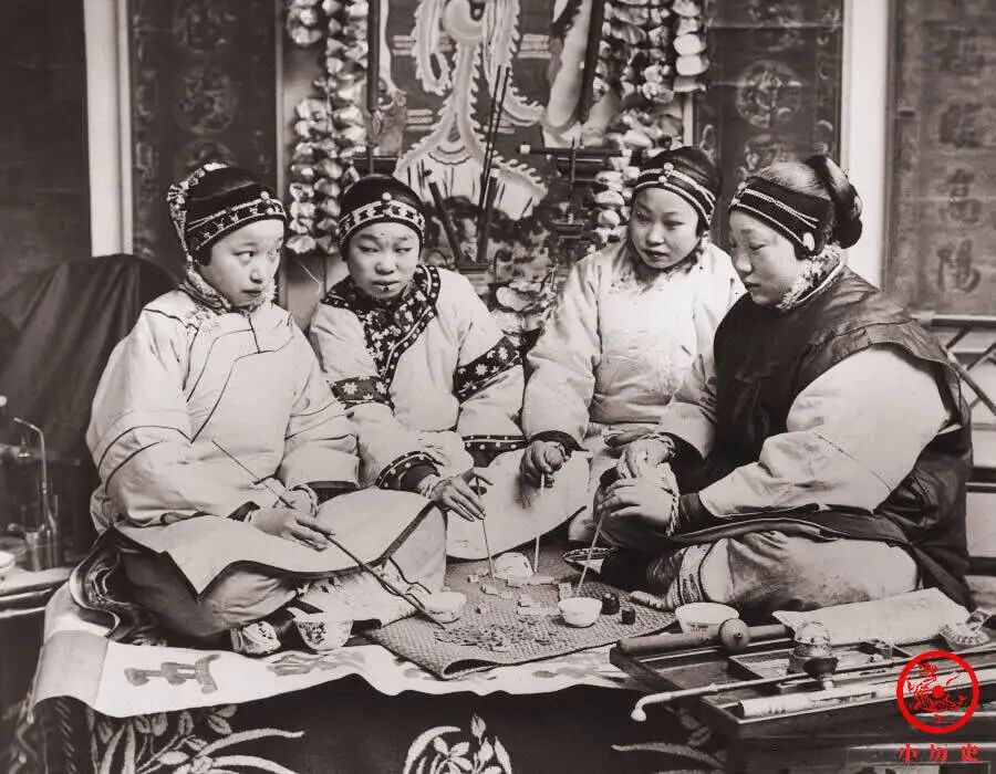 四位妇女都是地主家或财主家的妻妾。她们坐在炕上,手里拿着长长的竹签,面前摆着骨牌、铜钱、茶碗等物品,正在玩一种赌博游戏。大家注意她们的眼神,互相送白眼,似乎谁都不服谁。此外,她们身边摆着水烟、旱烟和鸦片烟枪,看来个个都是“瘾君子”。