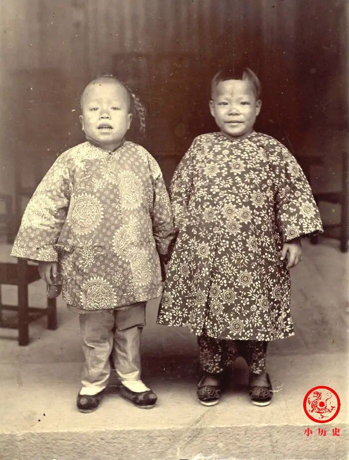照片中的儿童穿着大花袄,虽然现在看来可能不太符合我们的审美标准,但是在那个时代,这种服饰符合当时的主流审美。而且在那个时代,只有来自相对优渥家庭的孩子才能穿戴得如此干净整齐。这表明,两个孩子的家庭经济条件较好,社会地位较高。