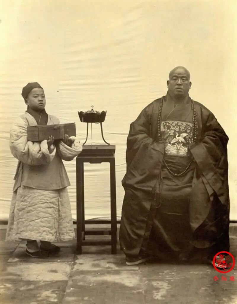 看他的架势,应该有很高的地位。他的僧袍上缀有禽鸟补子,这个补子只有清朝文官才能使用,他何以获得穿戴资格,不得而知。查尔德说:“他的僧袍是北京最肥大、最华丽的服装之一。”侍者恭敬地站立一旁,手中的木盒内装着佛经。