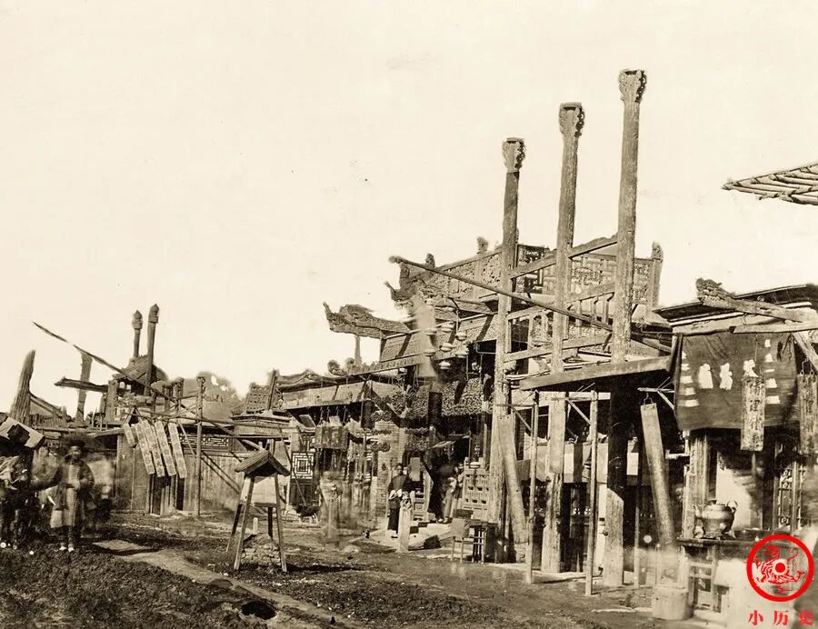 店铺的门面非常讲究,用木料做成各种各样的装饰,特别是三根冲天柱很显眼,直插云霄,寓意财气冲天。街道路面泥泞不堪,大概雨后不久。