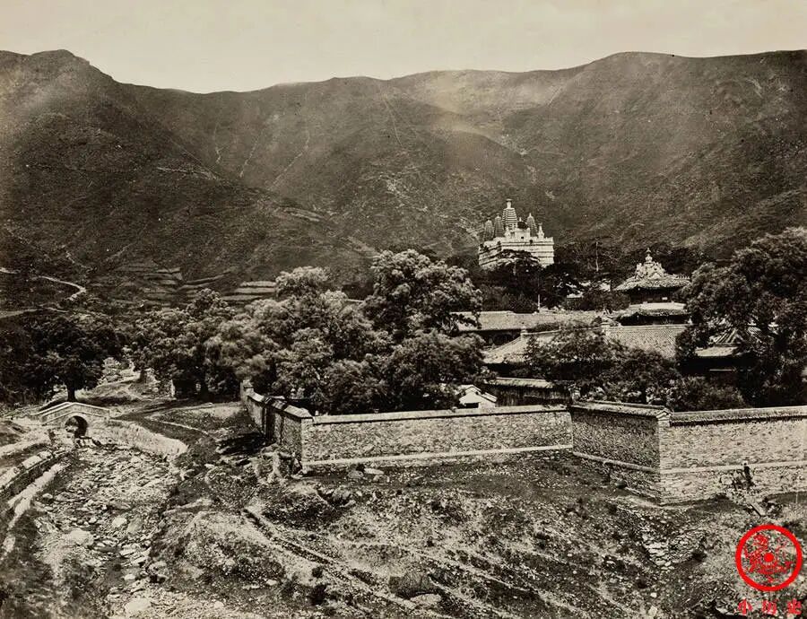 万寿山周遭的景观也是被英法联军烧毁的。从照片中看,巨大的佛香阁已经荡然无存,寺庙的其他建筑大多倾颓,地面上长满了荒草,一篇萧条的景象。