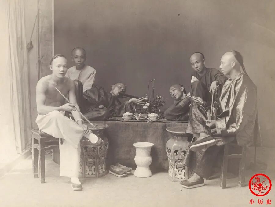这张照片布置了晚清鸦片烟馆的场景,6个男人吸烟、喝茶、聊天。他们展示了3种吸烟方式:躺在炕上的人吸食鸦片、左一打赤膊者吸旱烟、右一吸水烟。