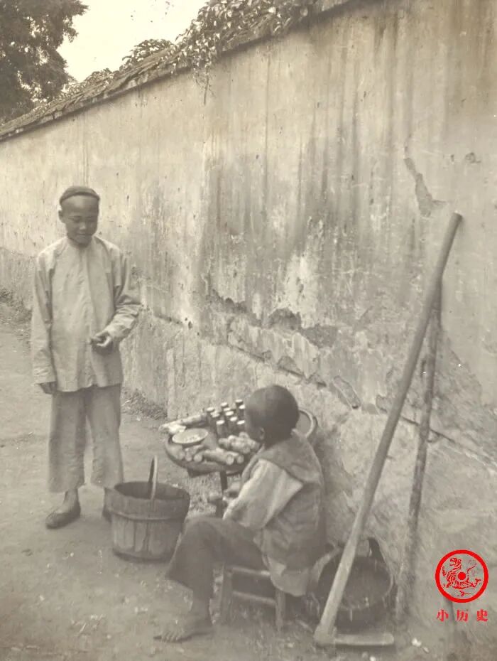 摊主不过是个小小少年,他面前笸箩里的甘蔗没有多少,可能是一整棵分割而成的,确实属于小本买卖。一天下来,他能赚够自己的饭钱吗?原本他这个年龄,应该去上学的,但是那时候读书的机会很少,去做点事情分担家庭责任,就成为他必然的出路。