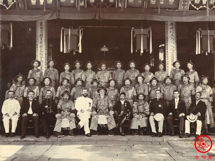 福州城里所有有头有脸的官僚——上至总督、下至知县——都出镜了,再加上他们穿着最正式的衣服——蟒袍,所以这个场合是非常庄重、隆重的。蟒袍又称花衣,一年到头穿不了几回,只在太后和皇帝过生日、庆贺新年、初次拜见上宪等重要场合穿着。这张照片拍摄于1905年,我们猜测是当地在太后或皇帝过生日之时举办了一场庆祝活动。前排三位福建官僚身份:左为都统文桂、中间为闽浙总督崇善、右为学政秦绶章。后面还站着福建布政使、福建按察使、福州知府等人物。