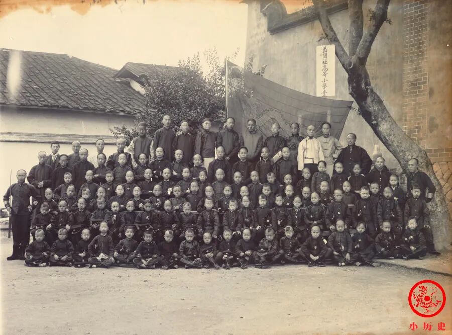 这所学校名为益闻社高等小学堂。根据1904年1月清廷颁布的新学制,各州县均设小学堂,分初等和高等两级,前者“以识字之民日多为成效”,后者“以童年皆知作人之正理,皆有谋生之计虑为成效”,分别修业4年,而后经考核合格可升入中学堂。师生们在合影时特意摆放了黄龙旗。