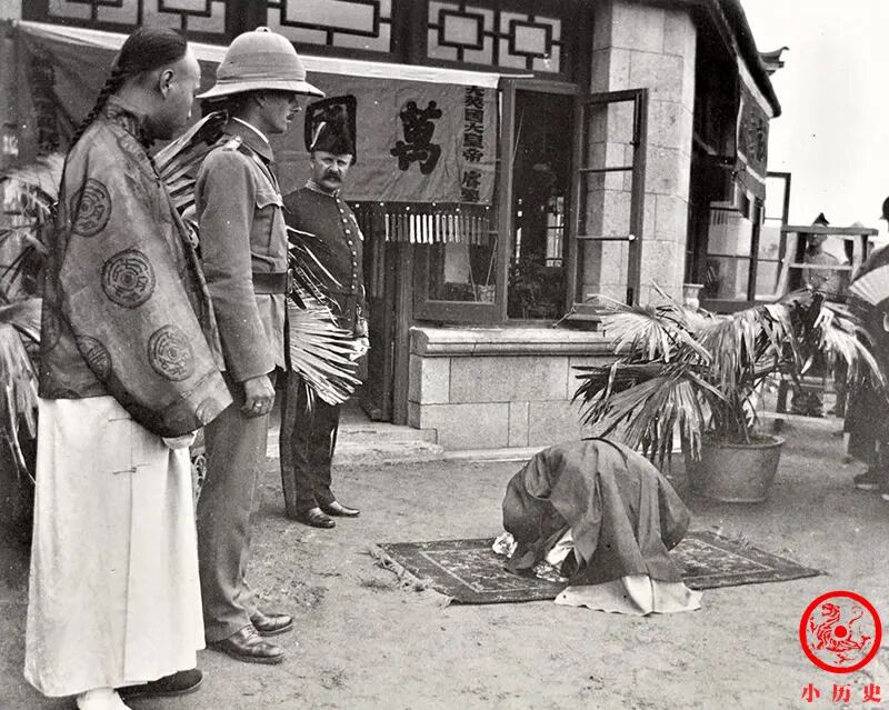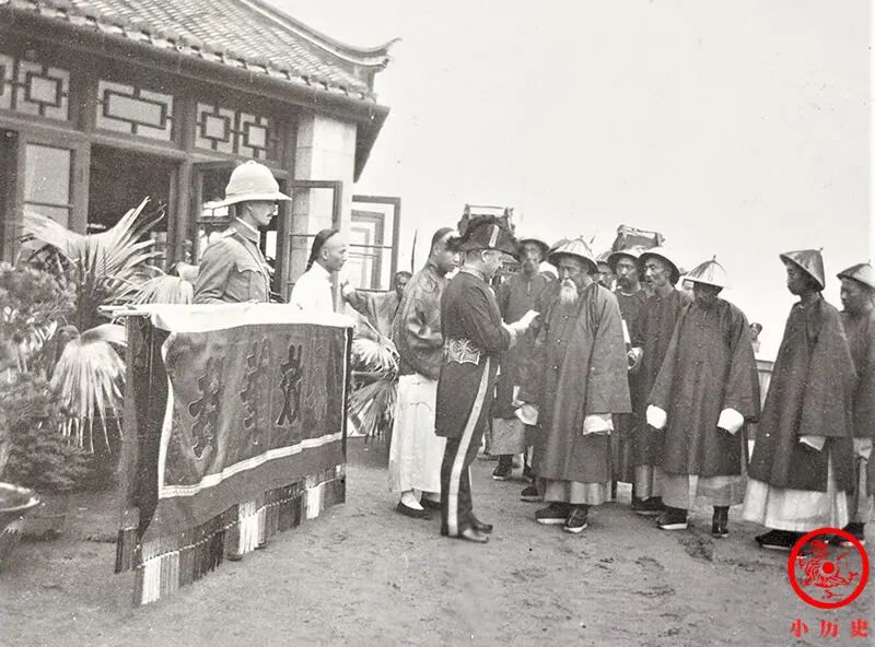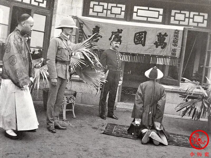 这些穿着官服的清朝官员,一到来就面向行政公署的正堂(可能摆着爱德华七世的照片或画像)行了三跪九叩大礼,估计骆克哈特都有点不理解。清朝臣民向皇帝所行的最隆重礼节,即“三跪九叩”,双膝跪地下三次,磕九个头。而英国臣民在国王面前只须单膝跪即可,不必磕头。