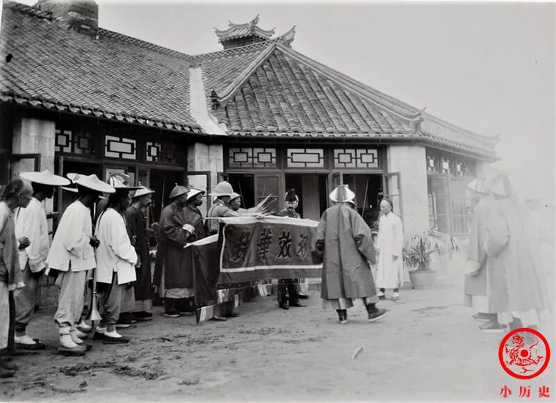 网上有人发表文章称,这些照片是清朝官员在北京向八国联军总部送锦旗的场景,事实上并非如此,请大家擦亮眼不要被误导。横幅左侧“大英大皇帝睿览”、右侧“威海码头商民敬献”可为佐证。