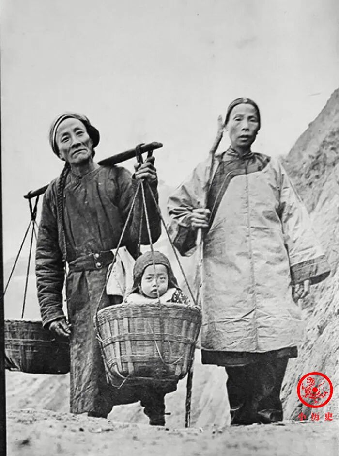 这一家三口应该是去赶集,或者赶集回来。坐在筐里的小孩,真是舒服自在。妇女拄着拐杖,未必是因为老迈,而是因为裹小脚行走不稳。