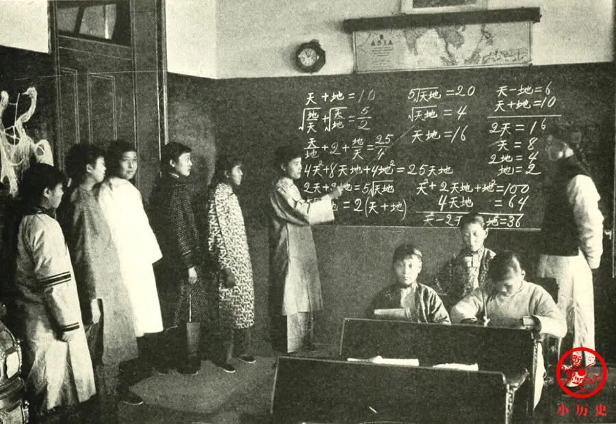 学校名为Chinkiang Girl's School,翻译过来当为镇江女子学校。师生们正在上数学课,黑板上写满了简单的公式,其内容大致相当于如今初中一年级的二元一次方程。所谓“天”“地”,也就是未知数x、y。