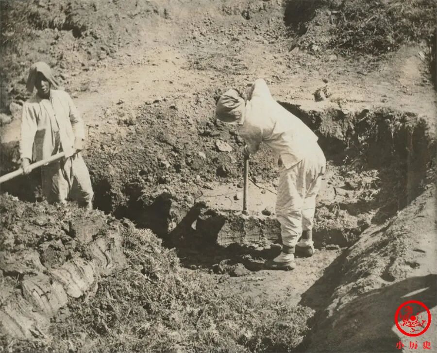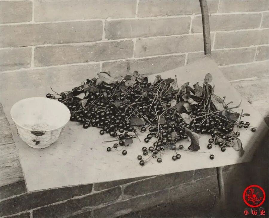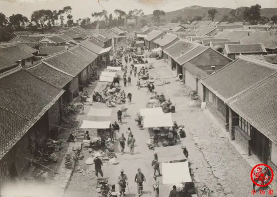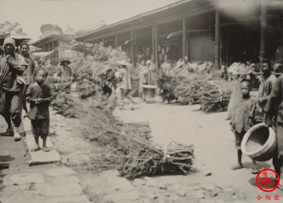 人们日常生活取暖、做饭都需要燃料,煤炭买不起,只好用柴草,由此形成了专门的市场。农民们砍了树枝打成捆,挑到城镇的柴草市场上售卖。照片中这条街道两边摆满了成捆的树枝,可见需求比较旺盛。