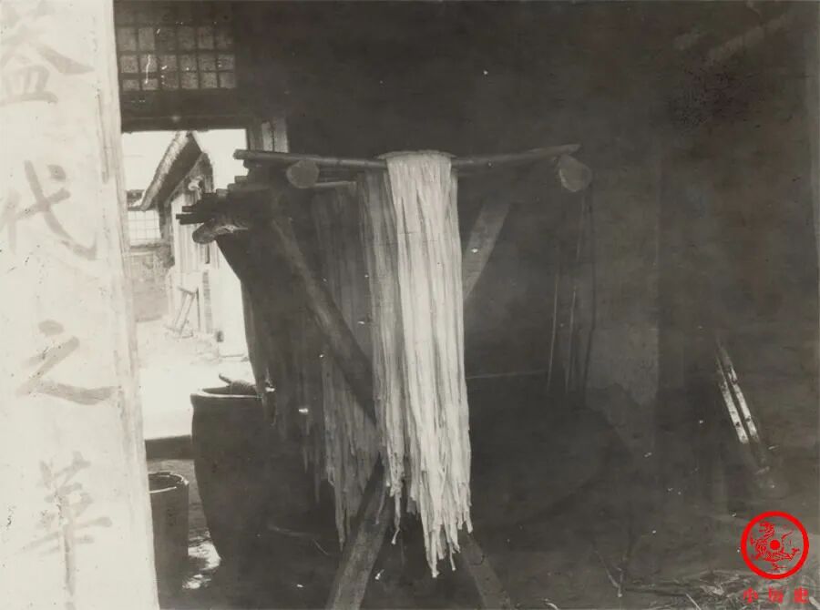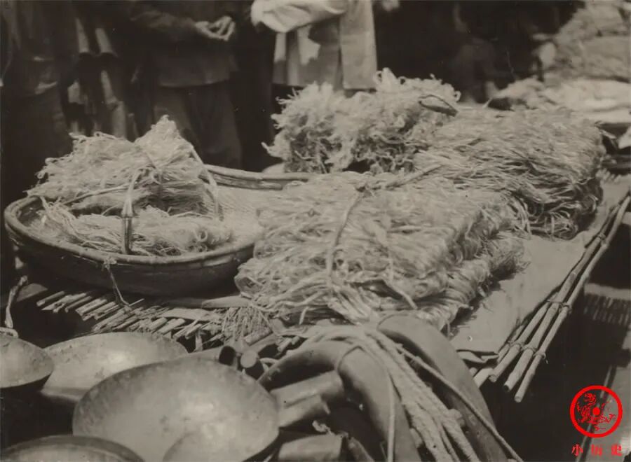 面条以绿豆面为原料,刚刚用机器加工而成。我以为那个年代的面条都是手擀面,没想到也有了加工机器。当然,这种机器应该是人力驱动、木制的简陋装置,与现在的电动机器不是一个概念。