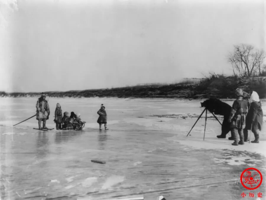 寒冷的冬天,黑龙江被冰封,人们可以自如地在上面奔跑行走。一名摄影师摆开架势,为冰上行人拍照。
