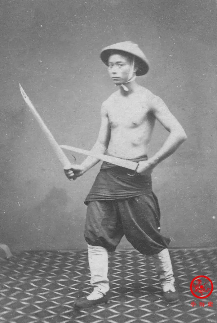 这名赤膊的士兵拿着双刀,眼睛射出锐利的目光,似乎能把敌人一刀毙命。但他的身板很瘦,一点儿都不壮实,到战场上未必能占优势。