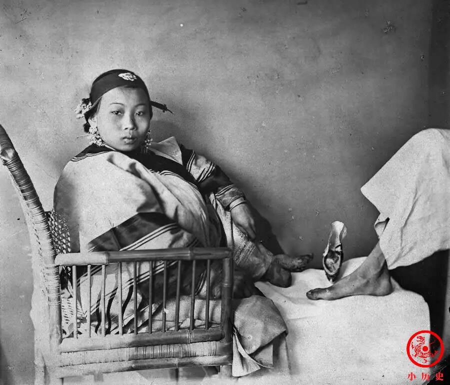 这张照片由约翰·汤姆森于1870年在厦门拍摄。当小脚妇女解开裹脚布,他差点被冲出的臭味熏晕,他记述道:“她在一位老嬷嬷的陪同下前来,为了让她答应做这件低俗难堪的事情,我还必须大方地贿赂她的这位随从。但是说实在的,我还想赶紧从这样一个难受的场面中抽身出来呢,因为那所谓的三寸金莲,不管是从外观上还是从气味上,都与那种最圣洁最美丽的花儿相去甚远。”