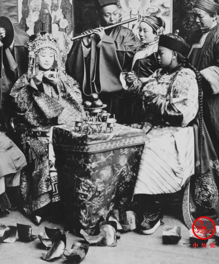 新婚夫妻穿着盛装,在众人围观下象征性地吃了第一顿饭。他们看上去只有十二三岁左右,有童婚嫌疑,但在当时情况下司空见惯,并不奇怪。根据《大清通礼》,男子16岁、女子14岁为法定婚龄,事实上,在法定婚龄之前结婚的大有人在,而官府从不追究,民间甚至认为越早结婚越好。