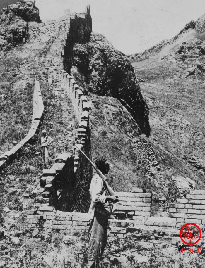 明朝之后,清朝对长城没有保护和修葺,所以到晚清就成了一副破败不堪的模样,很多墙体完全坍塌。照片前景中扛枪的男子,是巡逻的士兵还是捕获动物的猎人?他穿着普通劳动者的服装,是猎人的可能性更大。