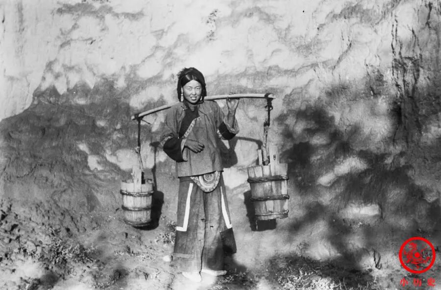 这位妇女挑着两只木桶去打水,脸上同样挂着明媚的微笑。
