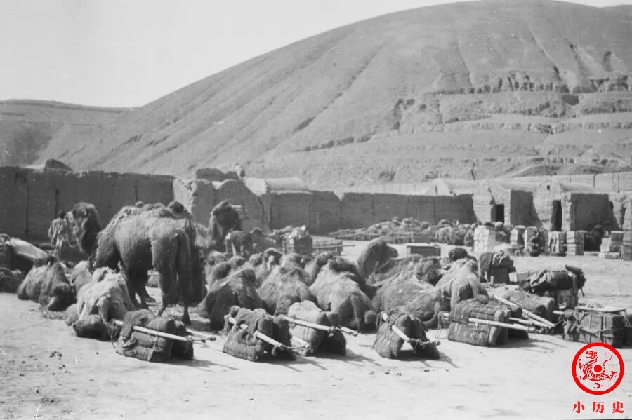 在干旱地区,驼队相当于转运货物的“火车”,数十头骆驼首尾相连,驮着粮食、布匹、药品、茶叶等各类物资,长途跋涉,浩浩荡荡地奔向目的地。照片记录了两支驼队在客栈里休整的情景。