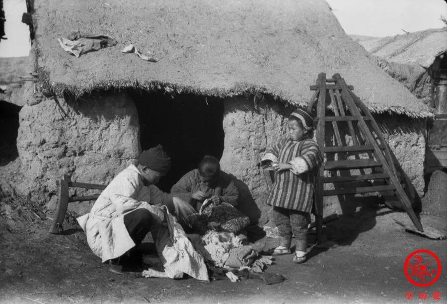 这张照片展示了一个农民家庭的生活条件。房屋就是用土坯和茅草盖起来的,非常低矮、破旧,由此足见当地百姓生活多么贫穷艰苦。