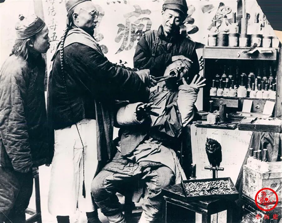 我国古代发展出了牙科门类,《史记》中就有关于西汉医生仓公治疗龋齿的记载。这张照片则记录了晚清医生为病人拔牙的真实场景,非常珍贵。这名牙医用一把老虎钳拔掉病人的牙齿,病人因为剧痛而面部扭曲、双手乱舞。再看看摊位的卫生条件,可谓差到极点,极易造成细菌感染。