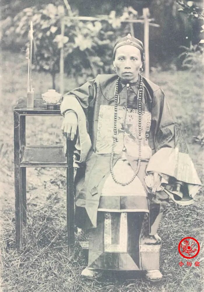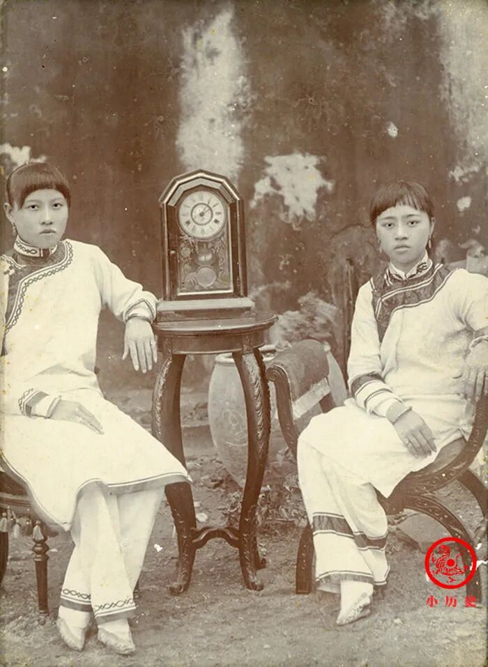 两个人的头饰、服装,均处于晚清时尚的前沿,尤其是突出身材线条的袄裤,一改宽袍大袖的款式,可谓领风气之先。只有她们的小脚,告诉我们这两人是在传统时代长大的。