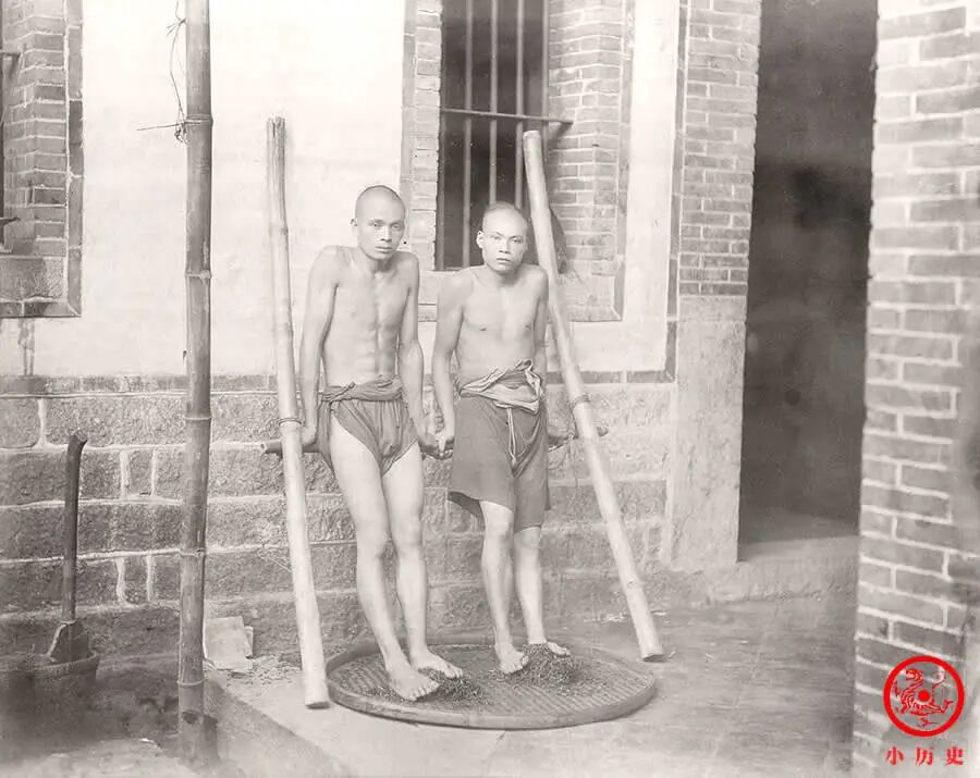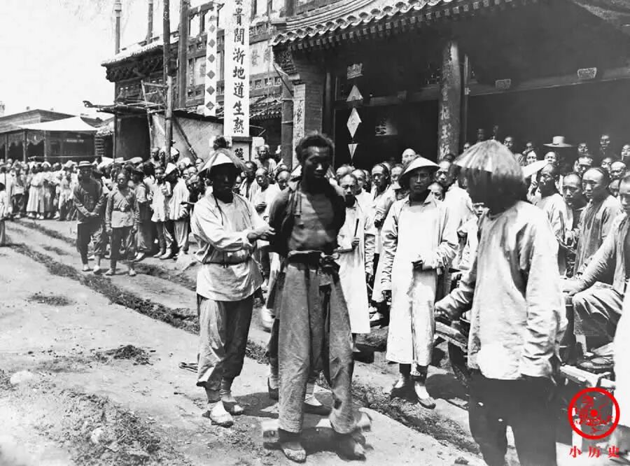 这名囚犯瘦弱不堪,双脚戴着镣铐,双手被反绑,他正在一群衙役的押送下前往刑场,接受极刑的惩处。街上里三层外三层围了大批闲人看热闹。