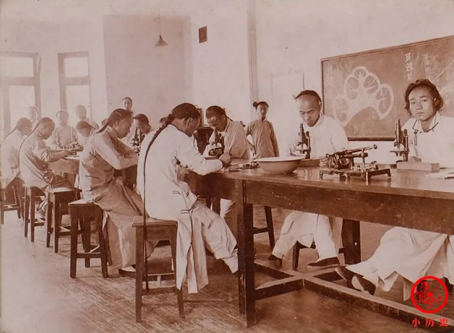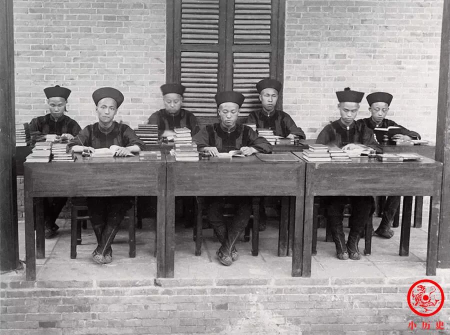 北洋水师学堂设立于1881年,学制为5年,食宿费用全免,设置驾驶和管轮两个专业。学生除了学习专业课程,还要学习英语和四书五经,比较注重全面发展。照片中正在认真学习的学生属于驾驶专业。