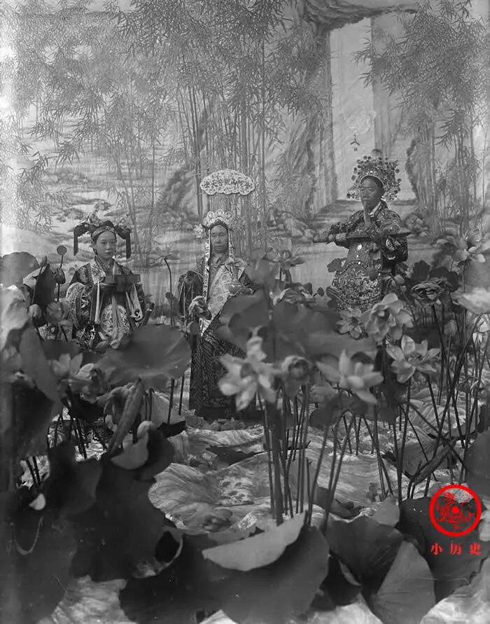 这张照片拍摄于1903年,时年68岁的慈禧太后扮观音大士,一手拿着净水瓶,一手拿着杨柳枝;大太监李莲英扮护法韦陀,手持金刚杵;四格格(庆亲王奕劻之女)扮龙女,手捧一函书册。