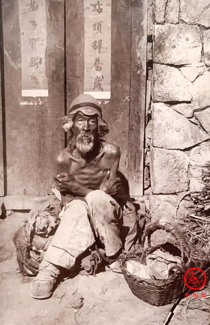这位老汉瘦骨嶙峋,形容枯槁,让人心生怜悯。根据门上的对联“辞旧岁”“迎新年”判断,照片拍摄于春节前后,天气依然寒冷,所以他双臂抱于胸前,尽量取暖。他是一位无家可归的乞丐,我们判断摄影师为了突出他的可怜形象让他脱掉了破旧的棉衣。