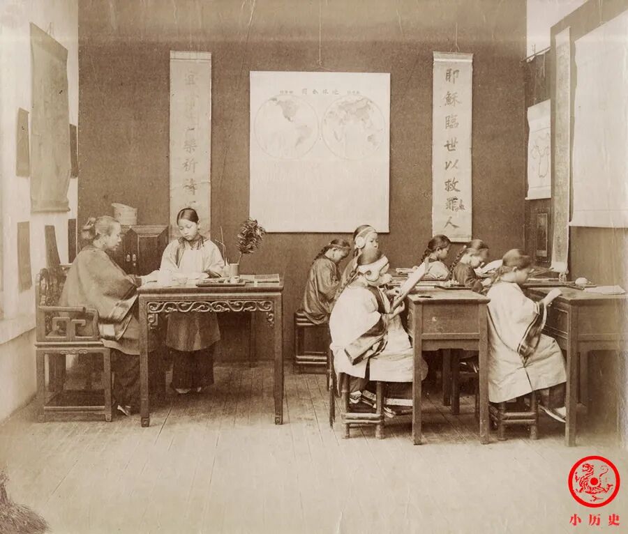 根据教室的布置来看,是传教士创办的女学堂,而学生们的课程则很传统——女红。